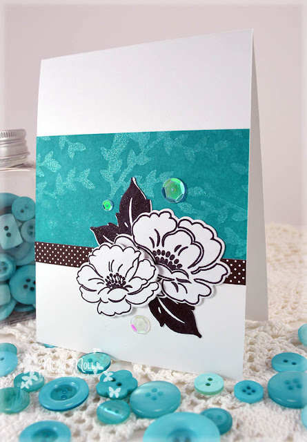 I used PaperTrey Ink's "Vintage Linens" stamp set to stamp the flowers in black dye ink. I then die cut them with the "Vintage Linens" matching die set. I adhered the leaves and flowers to the front of the card, using foam adhesive on the left flower to give it a bit of dimension.