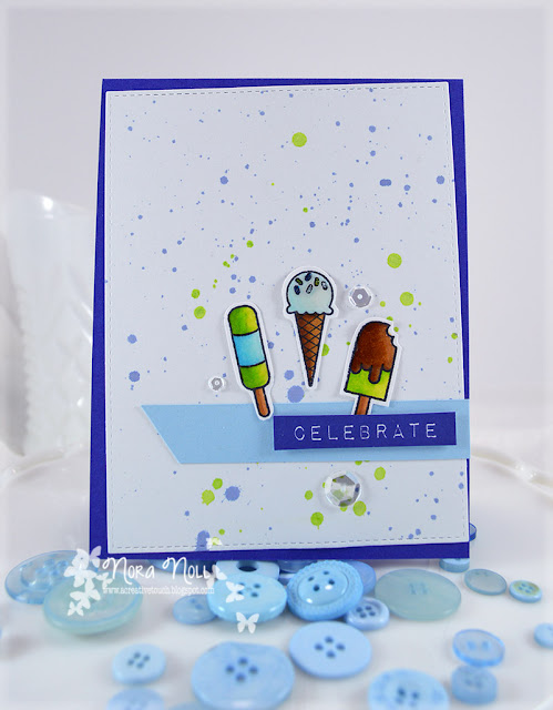 When everything was dry, I assembled the card. I used a scrap of powder blue card stock to make a banner to go across the card. I then adhered the ice cream confections over the banner. Next I adhered the stamped label using foam adhesive over the banner. My last step was to adhere some clear sequins from Pretty Pink Posh.
